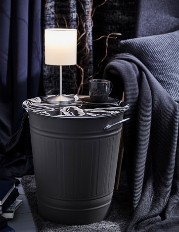Skraldespanden Knodd fra Ikea kan bruges til meget mere end affald. Man kan for eksempel placere en Ikea Avsiktlig bakke oven på spanden og bruge den som et lille sofabord med indbygget opbevaring. Ikea anbefaler, at man monterer nogle Ikea Montera kabelkanaler under bakken, så den ikke glider.