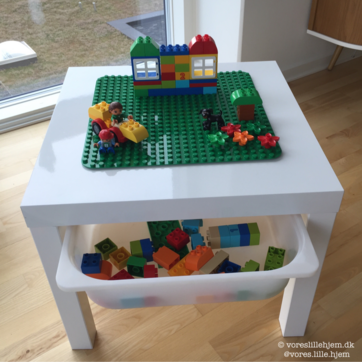 Da Christina Beck Darmer, der deler boliginspiration på bloggen ”Vores lille hjem,” manglede et sted, hvor hendes søn kunne bygge med sine Duplo-klodser, konstruerede hun et legebord med indbygget opbevaring af et Ikea Lack sofabord, en Ikea Trofast kasse, en Duplo-byggeplade og to skinner, som blev købt i Ikeas kundeservice for 20 kroner.