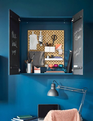 Opslagstavler er praktiske, men kan nemt få et rum til at fremstå rodet. En smart løsning kan være at gemme opslagstavlen væk i et skab. Her har Ikeas indretter Emma Parkinson placeret en Ikea Skådis opbevaringstavle i et Ikea Ivar skab. Det ubehandlede fyrretræsskab er blevet malet i samme farve som væggen, og skabets inderlåger er malet med tavlelak, så man kan bruge dem til beskeder. Til sidst er Skådis blevet monteret i skabet.