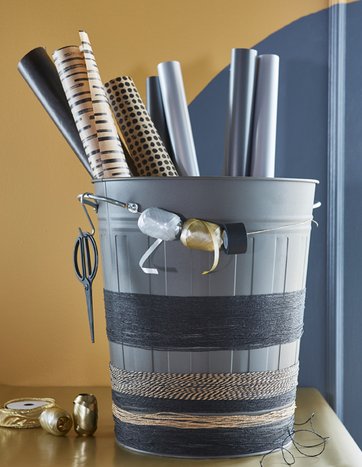 Man kan også bruge spanden som indpakningsstation. En snor spændt ud mellem grebene kan bruges til gavebånd, og en saks kan hænges fra en S-krog. Se flere muligheder for brug af Knodd her.
