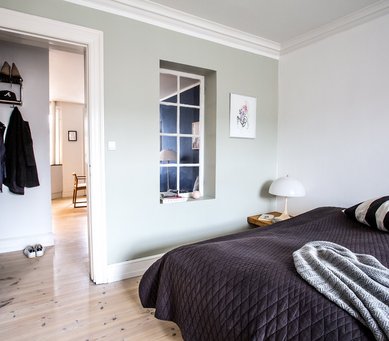 I soveværelset er væggen bag sengen malet i en lys, støvet grøn for igen at signalere soveafdeling modsat kontordelens hvide univers.