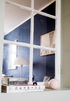 - Vi skifter relativt tit farver på væggene og på tilbehøret, for det er en nem måde at opdatere boligens udtryk. Lige nu kører vi med den blå i spisestue og stue, fordi jeg synes, at den får det bedste frem i træmøbler og trærammer, mens den pastelgrønne i soveværelset giver en lidt sydlandsk stemning a la Mallorca. Lige til at dase hen i, siger Jeppe.
