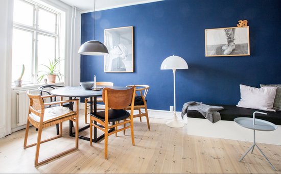 For at definere hvert rums forskellige funktioner har Jeppe blandt andet tænkt i farver. Væggen bag spisebord og stuedelen er malet i en stærk blå, der giver en helt anden stemning end i rummets meget hvide del, hvor køkkensektionen er.