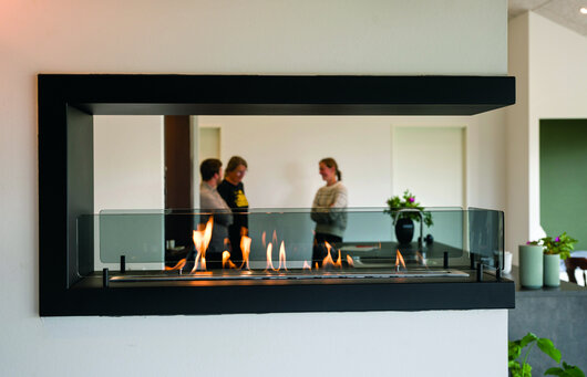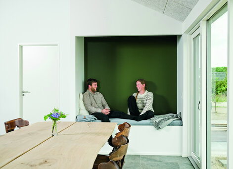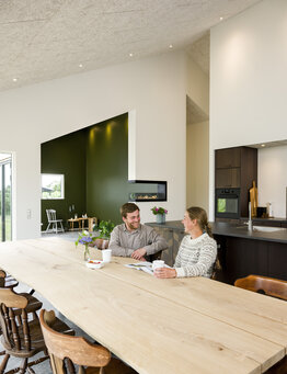 Undervejs har Inge justeret, tilføjet og fjernet. Blandt andet ville hun have haft en brændeovn, men droppede det, fordi hun valgte græstag på en del af huset og ikke ville have en skorsten sammen med det potentielt tørre tag. I stedet valgte hun en biopejs, som sidder i halvmuren mellem køkken og stue: