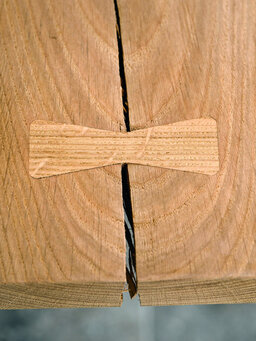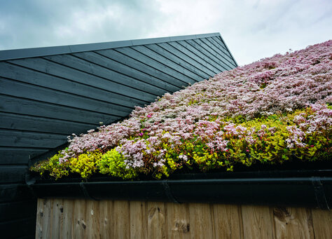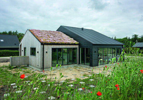 En del af huset er bygget i termowood, som er varmebehandlet, så al harpiksen er trukket ud af træet, og det derfor er knastørt, når man får det. Inge valgte det, fordi man ikke behøver at male det. Den nuværende brune, gyldne farve skifter til en grålig tone på sigt.