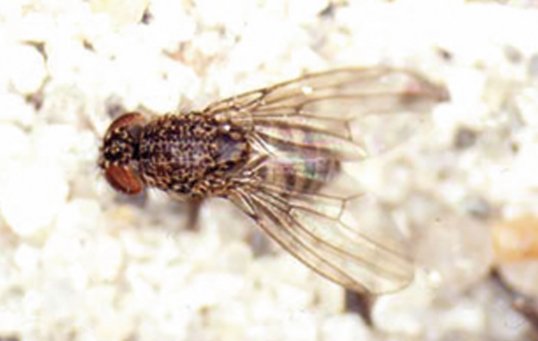 Voksne bananfluer 3-4 mm lange og gulligbrune.