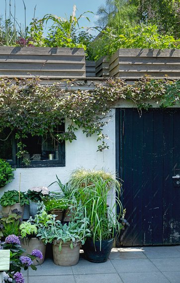Her er det carporten, der lægger tag til ikke mindre end ni større højbede bygget i falset lærketræ. Højbedene er fulde af spiselige afgrøder, der nyder godt af at være placeret højt og solrigt.