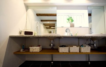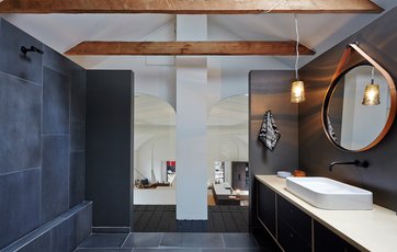 Dette utraditionelle badeværelse ligger på førstesalen i et gammelt missionshus, der er ombygget til moderne familiebolig. Badet er delvist åbent – man kan dog godt skjule sig for indkig, når man står i bruseafdelingen. Vægge og gulv er beklædt med matsorte naturstensklinker. Skabet er specialfremstillet med bordplade af krydsfiner og skuffefronter i linoleum – et materiale, der egner sig godt til det fugtige miljø i et baderum. Det sorte blandingsbatteri er fra Vola, mens vasken er købt hos Cassani.