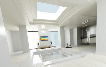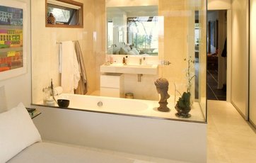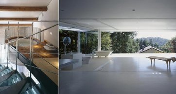 Her er et par ekstreme eksempler på åbne badeværelser. Lyset bliver hentet ind i i hele rummets bredde. Et hus uden skillevægge og glasfacader samt et badekar, der svæver frit i rummet. Mod eller overmod? Frækt eller for meget?