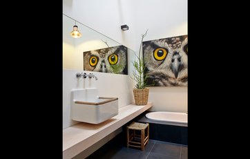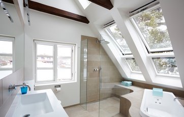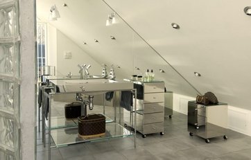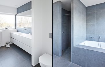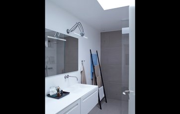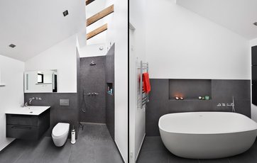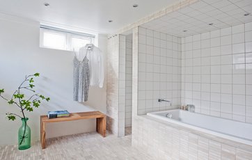 På det kun 9 m² store badeværelse er der blevet plads til både bruseniche og luksus- jacuzzi. Hvad rummet ikke har i kvadratmeter har det til gengæld i loftshøjde og lysindfald. Badeværelset er tegnet af arkitektfirmaet Birch & Rasmussen. Rummet er åbnet til kip med en loftshøjde på 3,7 m. De nordvendte tagvinduer giv masser af lys og kig til træerne udenfor. Badekarret er bygget ind i et flisebeklædt plateau, der smyger sig elegant igennem rummet. Fliserne er fra Atlas Concorde model Stay – Skyline.