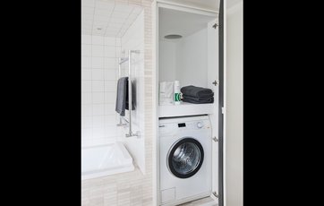 Vaskemaskinen er gemt diskret væk bag en låge. Det er også her vasketøjsskakten fra 1. salen ender. Vil du have en tilsvarende skakt, kræver det, at du tænker løsningen ind tidligt i dine ombygningsplaner, da det er dyrt og besværligt, at få eftermonteret røret.