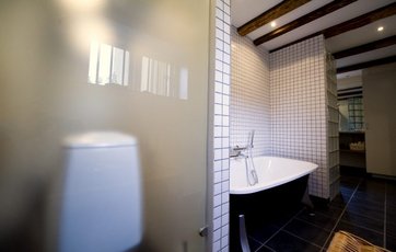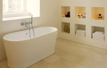 I badeværelset kan man skabe en eksklusiv stemning med et smukt fritstående badekar. De små nicher med lys i harmonier fint med badeværelsets øvrige stemning.