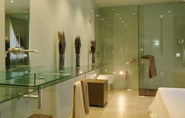 Vælg materialer med omtanke. Glas kan bruges i mange elegante løsninger, her er glasset både anvendt som vægbeklædning, afskærmning ved bruser samt til vask og bord.