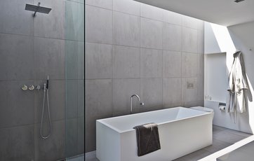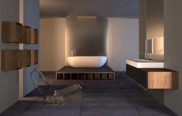 Arkitekten bag dette bad, Rasmus Skaarup har arbejde bevidst med at gøre rummet lidt mindre og hyggeligere bl.a. ved at ”indbygge” badfunktionerne i en niche, så det ser ud som om de er ”skåret ud” i den ene væg. For at understrege ideen, er overgangen markeret med to typer af fliser – blanke i nichen og matte, naturfarvede udenpå. Alle fliser er fra Starck.