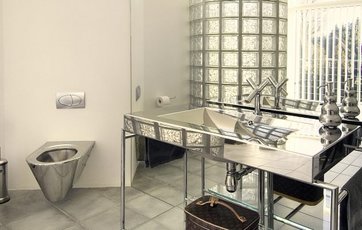 Vaskemøblet er fra "Gå glad i bad" og med armaturer fra Phillippe Starck. Brusenichen er bygget i glasbyggesten.
