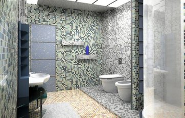 Hvis ikke du bliver skræmt af for mange mønstre og farver, kan du vælge dekorativ mosaik på både væg og gulv. De to farvesammensætninger understreger badeværelsets opdeling.