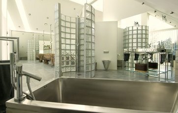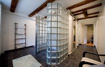 I en villa blev kælderen indrettet til "klargøringshal" for hele famlien. Man tager brusebad bag glasbyggestenene. Det øvrige rum er primært til omklædning og klargøring.
