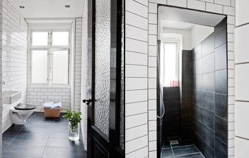 Blanke vægfliser og matsorte gulvklinker understreger den herskabelige stemning i dette bad, der er indrettet i en gammel københavnerlejlighed. Badeværelset er placeret i det, der tidligere var køkkenet. Det oprindelige toilet på bagtrappen er omdannet til en rummelig bruseniche. Alle fliserne er fra Evers, og døren er den originale køkkendør, som er blevet malet højglans sort.