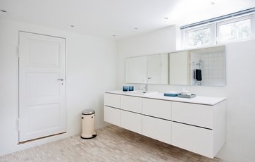Den bedste gave, man kan give sig selv, er et ekstra vindue. Det mener i hvert fald arkitekt Rasmus Skaarup, der har tegnet dette badeværelse. Badet ligger en kælder, og har vinduer til to sider, og det gør rummet lyst, på trods af beliggenheden. Bademøblet har arkitekten selv bygget.