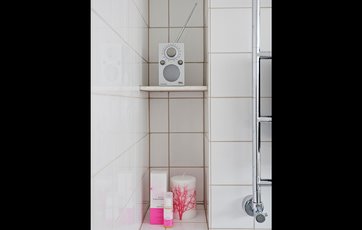 En niche i væggen giver praktisk opbevaringsplads til sæber, duftlys og radioen, der gør opholdene på badeværelset lidt ekstra hyggelige.