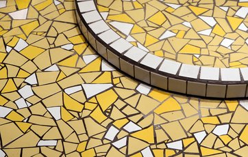 Dette badeværelsesgulv er lavet af ituslåede fliser i forskellige gule nuancer. Mosaikkerne lægges enkeltvis og så formerne passer sammen. Flisestykkerne limes fast efterhånden, som mønsteret bliver lagt, og fuges til sidst med flisefug. Man kan bruge billige fliser fra byggemarkedet eller købe brugte fliser i et genbrugsbyggemarked.