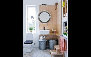 En gammel skolevask er blikfang i dette baderum, der er indrettet til to børn. Rummet er åbent til kip og det fine dagslys strømmer ned fra et rytterlys i taget. Den lange træhylde er lavet af gulvbrædder fra Dinesen. Det indbyggede badekar er så lavt, at børnene selv kan kravle ind og ud af det. Naturflisen på gulvet hedder Black Dragon og hanen er fra Steinberg. Lampen, som kan ses i spejlet, er af Tom Dixon.