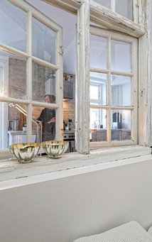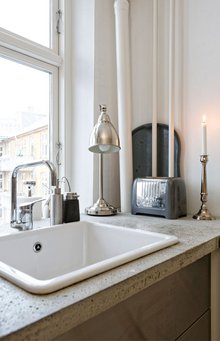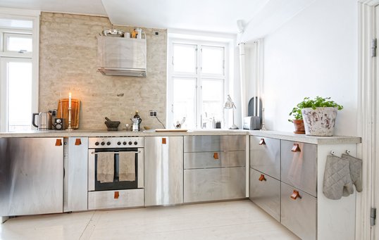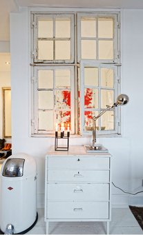 Her sørger et gammelt, afskallet vindue nu for ud- og indsyn og tager brodden af den i øvrigt forholdsvis strømlinede indretning. På samme måde er et Ikea-køkken med stålfronter blødt op ved hjælp af læderstropper som håndtag og en 300 kilo tung bordplade af beton støbt på stedet af Josefines svoger, Henrik Aaboe, som er snedker.