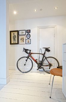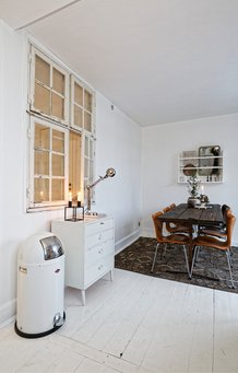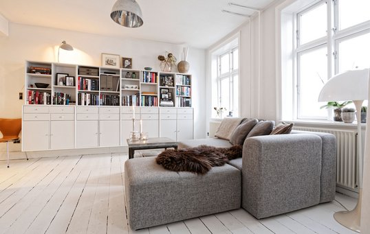 Hvidt fra øverst til nederst – inklusive fyrretræsgulvene. Det får lejligheden til at syne lysere og større. Også møblerne er fortrinsvis lyse.