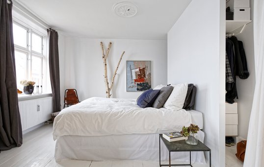 I stedet for et massivt klædeskab fandt Josefine og hendes kæreste en alternativ og anderledes løsning: Bag sengen blev der opsat en 10 cm tyk armeret gipsvæg. Fra hver side af væggen er der indgang til to åbne skabe med bøjlestænger og hylder.