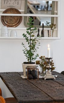 – Jeg kan lide at have mange forskellige rå materialer omkring mig som skind, beton, træ, marmor og zink. Og jeg holder af at få naturen indenfor i skikkelse af et birketræ i soveværelset og et ramponeret spisebord, hvor det rustikke kombineres med køkkenets skinnende og blanke, som jeg helst ikke vil have alt for meget af omkring mig.