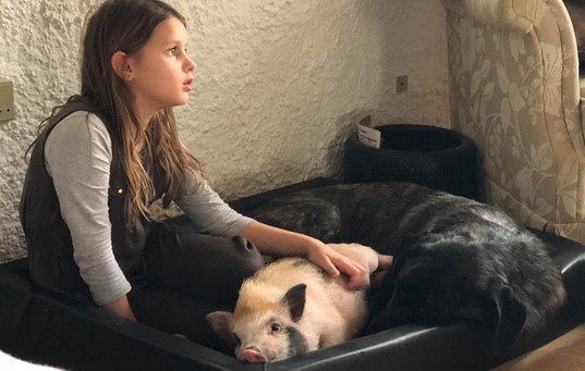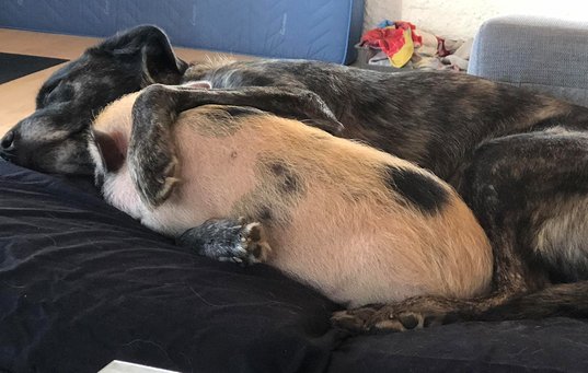 Hjemme i Odsherred ventede Maja, en fireårig gadehund, der blev fundet som hvalp i Tyrkiet af en dansk guide og taget med til Danmark. Det første møde gik over al forventning. Maja var fuldkommen forgabt i den lille gris, og den ansvarsfulde hund påtog sig med det samme forældrerollen.
