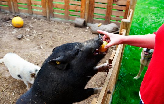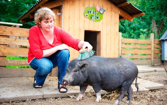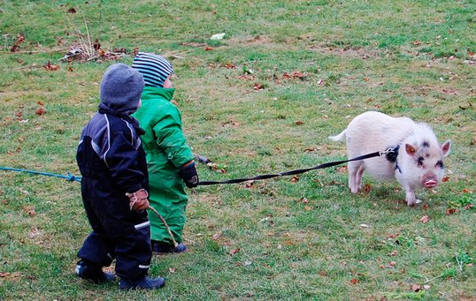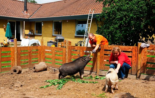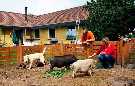 Hele familien er ude hos Egon og Werner mange gange dagligt. De snakker og kæler med grisene, som er optaget i familien på lige fod med hunden Scott.