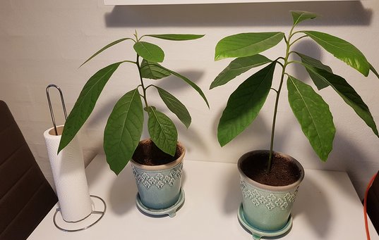 På Videncentret Bolius' Facebook-side har Alice Grobb delt dette billede. Hun fortæller: Planten til venstre er fra en halv avokadosten, jeg satte i jord, og stillede krukken på toppen af mit køleskab. Glemte alt om den, men ca. 1 måned senere var der pludselig en lang, tynd stængel på 20-25 cm. Så fik jeg ellers fart på. Den fik en ordentlig skud vand og godt 2 år senere ser den sådan ud med 2 stilke med blade på og er vel 50-55 cm høj. Planten til højre er også fra sten af frugten, men her dyrkede jeg den som foreskrevet. Den er vel omkring 1 år, men den vokser ikke så pænt som den første.