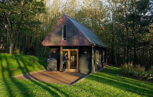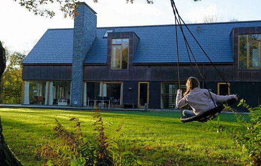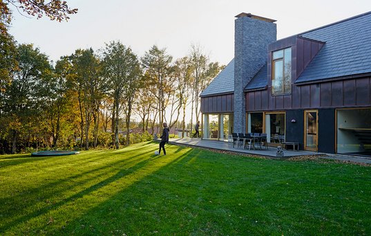 Det kunne næsten ikke klæde hinanden meget bedre. Husets rødbrune kobberfacade og egetræsvinduer i en skov ramt af efterårets farver.