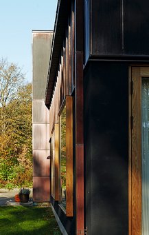Huset består grundlæggende af fire materialer: skifer, egetræ, sort puds og kobber.