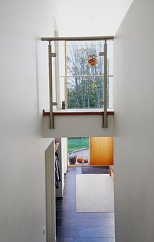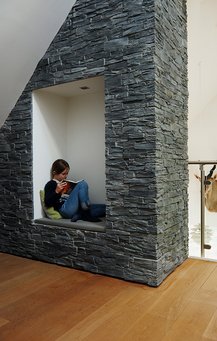 – Skorstenen er omdrejningspunkt for husets rygrad. Vi har holdt fast i dens placering og ladet den gå igen indvendigt med skifer på. Det giver genkendelighed og binder ude- og inderum sammen, fortæller Jesper Korf.