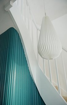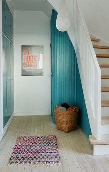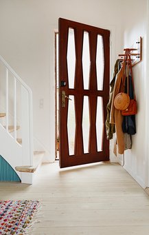 Det gennemgående parketgulv i fyrretræ og husets mange teaktræsdøre er husets oprindelige, men har nu fået en kærlig hånd. Også detaljer som træpanelerne under trappen, den snedkererede hoveddør og de runde støbejernsvinduer i gangen har fået lov at blive. Sjove detaljer, der aldrig ville blive lavet i dag og derfor fortæller noget vigtigt om huset.
