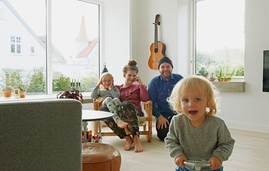 Hvem bor her: Dan Hjernø, musiker, Line Rasmussen, lærer, samt børnene Karla på seks og Wille på to år.