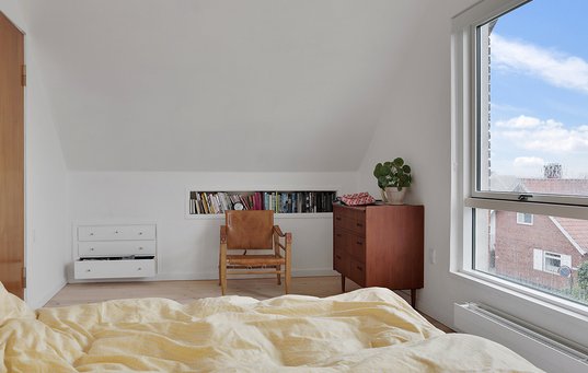 Herudover blev vinduerne i soveværelset udskiftet til nogle større, der samtidig sidder så lavt, at de nu får glæde af den fantastiske udsigt fra rummet. Et nyt dørparti til haven har også givet mere lys og skabt en bedre forbindelse til grundens grønne arealer. En ændring, der skiftede fra ’nice to have’ til ’need to have’ for familien undervejs i projektet.