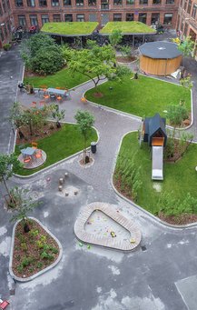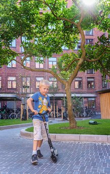Beboernes gangmønstre blev på forhånd kortlagt, og ud fra det blev der anlagt brede, belagte stier. Alle gårdøerne er omkranset af kantsten, fordi mange mennesker er fælles om gården, og kantsten markerer, at her er et tæppe, man træder op på og ikke blot går igennem. Desuden gør de snerydningen nemmere.