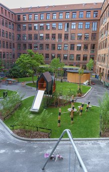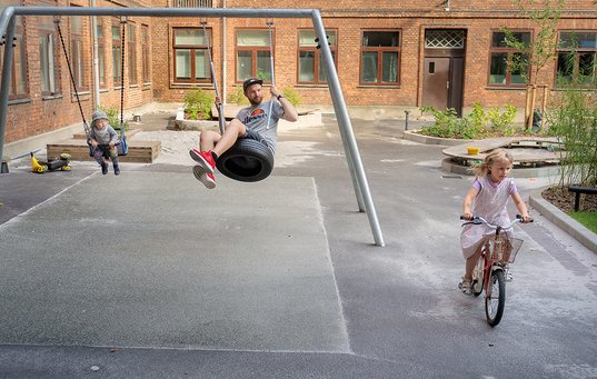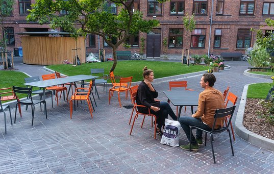 Vi er i en gård på Ydre Nørrebro i København. Her inden for det aflåste byrum har beboerne i Andelsboligforeningen Nørrebro deres eget frirum. Mens det hektiske byliv med trafik og larm foregår udenfor, ånder der fred og ro indenfor. Her kunne beboerne sidste sensommer fejre, at deres gård efter en meget lang proces kunne tages i brug med helt nye grønne oaser.