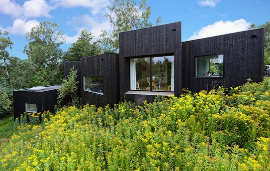 Sommerhuset er bygget op af klodser i forskellige niveauer.