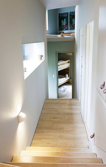 Huset har store fællesrum, men små værelser. Idéen med et sommerhus er at være sammen og ikke isolere sig; derfor deler de to ældste børn et lille værelse med køjeseng, mens der på en 10 m2 hems over børneværelset og i en alkove mellem stue og gæsteværelse er mulighed for at være alene, men alligevel tæt på resten af familien.