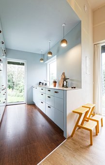 Materialer indvendigt: Gulve i egetræsparket, kork i køkkenet og fliser i entréen.