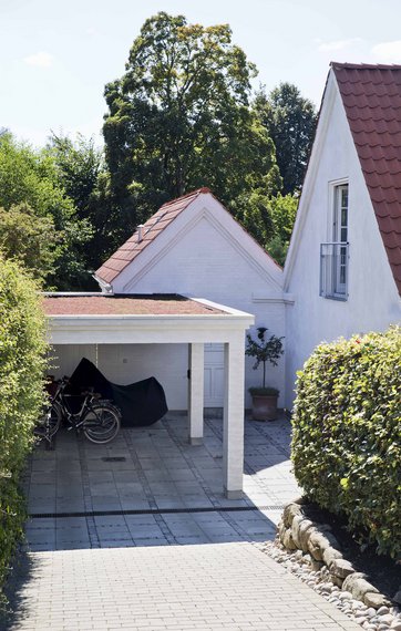 - Det giver et mere harmonisk udtryk, hvis hus og carport har samme formsprog. En hvælvet carport kan nemt komme til at skille sig ud og virke malplaceret, fordi vi sjældent bygger med buer herhjemme. På samme måde vil sortglaserede tegl komme til at se kunstigt ud på en garage til et typehus med lav rejsning. Lad materialer fra huset gå igen, og fortsæt så vidt muligt de eksisterende linjer i huset, råder Tine Nielsen.
