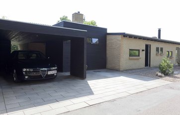 Bedømmelse: Et enkelt udtryk uden så mange dikkedarer. Vellykket udført, fordi carporten helt enkelt består af en forlængelse af husets tagkonstruktion.