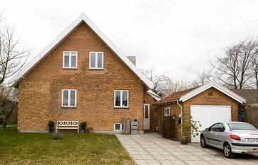 Bedømmelse: Med de røde mursten og det hvide træværk er garagen næsten en mindre udgave af huset. Hældningen på garagetaget er tilpasset den noget mindre bygning, så garagen får et udtryk, der er lige så harmonisk som huset. Her er det et godt valg at lægge garagen som en fritliggende bygning på grunden, ovenikøbet uden at det skygger for huset.