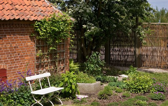 For bare 10 år siden var det en stor pløjemark. Men i dag ligger haven smuk og frodig med alleer, buske og hegn af pil, pragtfulde staudebede og duftende krydderurter, det hele lidt uden for den lille vestfynske by Assens - søkøbstaden i Lillebælts hjerte. Videncentret Bolius tog på havebesøg hos kunstnerparret Anne Marie Egemose og Erik Brandt i 2011.