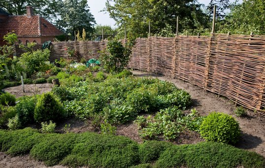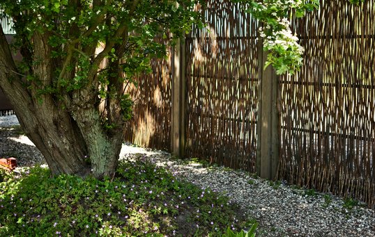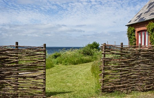 Haven er indhegnet med popler og smukke pilehegn, nogle store og flotte - blot bestående af høje træer, andre fine og små som dem omkring børnebørnenes legearealer. Andre er flettede på langs, som dem der beskytter mod havgus og vind, eller på højkant som dem der afskærmer mod vejen. Og atter andre er skulpturelt udformet som buen over trappen, der fører ned til havet, eller i diagonale mønstre, som dem ved indgangen til Anne Maries staudebed.
