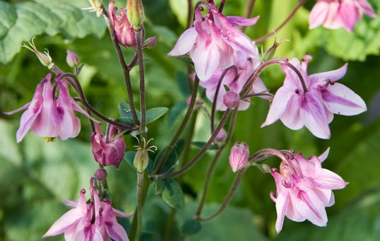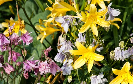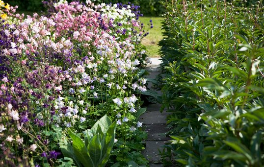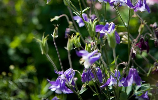 I forsommeren er der fuld fart på farverne i haven. Her en smuk blå akeleje.